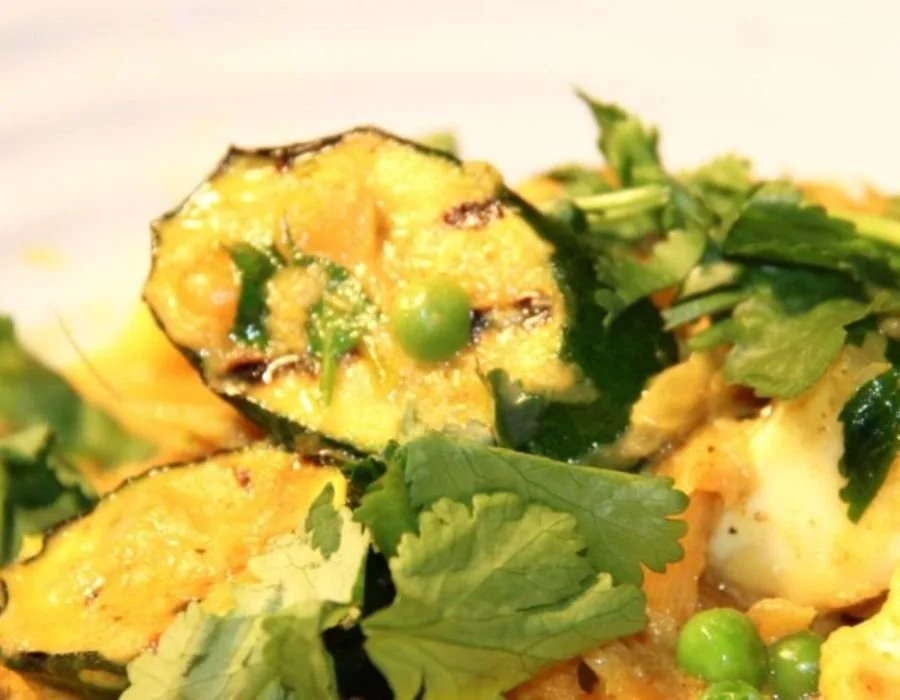 Diagonally chop the veg into ½ inch chunks of courgettes, sweet potato & cauliflower. Place on a griddle pan & cook both sides until you have griddles lines clearly showing. Add to the pan with the coconut milk & 1 heaped teaspoon of coconut sugar, chopped coriander stalks & leaves, peas & the freshly squeezed lime juice.