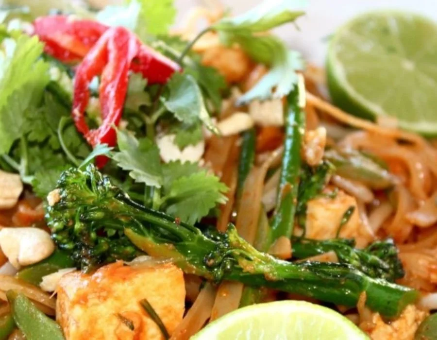 Pour the half the sauce into the pan on a medium to low heat & cook the onions & garlic for about 1 minute & then add the scallion, cilantro & toss together until the leaves have wilted. Then pour in half the sauce & allow to heat through. Then add the noodles & transfer the tofu & broccoli & heat through until cooked & serve immediately with fresh wedge of lime & chopped cashews or with extra cilantro if desired.